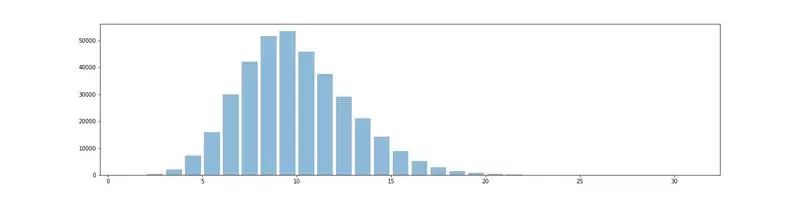 我们将引入一个特殊的字符(11)来表示每个字母的代码之间的空格。例如,SOS 的代码将表示为:...11---*...(替换...---...)。我们这样做是为了确保与给定代码相对应的单词是唯一的。接下来,我们将使用已编译数据集(words_alpha)中的英文单词,而不是用随机生成的字母集作为我们的数据。为了获得数据的感觉,参看下图所示的单词长度的直方图。从直方图上可以看出,长度超过 5 个字母的单词要比短的单词多。
