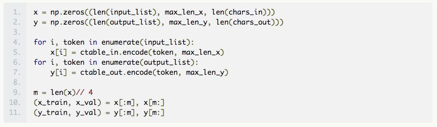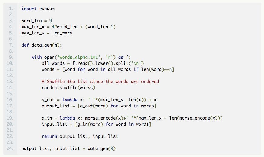 为了说明的目的,我们将从给定的固定长度的单词生成训练和验证数据。在这里,我们将这个长度固定为 9,因为长度为 9 的字数足够大(参见上述直方图)。注意,此举将意味着来自网络的输出单词的长度将是固定的,但是输入的 Morse 电码并不一定都是相同的长度。假定我们知道每个字母的编码长度最长是 4(其实我们不用这个特定的假设,可以选择的长度最长的 Morse 电码 max_length_x 来训练数据。)因此,如果单词的长度为 n ,那么与其对应的 Morse 电码的长度最多为 4n+(n-1),其中 n-1 对应的是 11s 的数量。我们用左边的空格填充代码,使它们的长度相同,这意味着我们输入字符的词汇表是 {‘.’, ‘—’, ‘*’, ‘ ’}。一般而言,我们让输出的字符词汇表是所有字母和空格的特殊字符。回到关于网络猜测长单词的评论,我们的意思是,由于长单词的数量会造成不平衡,因此网络将会倾向于猜测更少的空格。在下面的代码片段中,output_list 将包含英文单词,input_list 将包含填充的 Morse 电码。