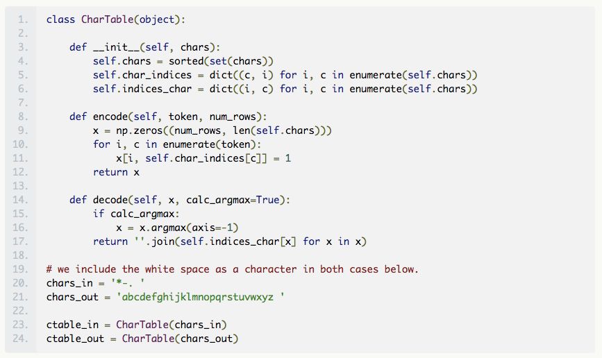 现在,我们构建输入中字符的一个独热编码矢量,使输入数据适合神经网络。为此,我们构建了一个类对象(类似于 Keras 文档中的例子),它将有助于编码和解码,并将 Morse 电码和英语单词解码。我们将类分配给具有适当字符集的对象。