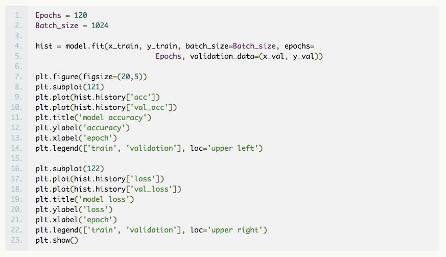 我们将模型拟合到数据中,在集合 x_train、y_train 上进行训练,并使用 x_val 和 y_val 来查看我们的工作情况。需要设置的最后一组参数是轮数(epochs)的数量和批大小。批大小是在梯度下降算法中通过网络传递的训练集的大小,然后对网络中的权重进行更新。通常批大小就是计算机内存可处理的最大值。一个轮数是通过这些批次的训练数据的全面训练一次。此处,我们设置了 1024 的批大小,使用了 120 个轮数,在下图即可看到,在大约 100 个轮数之后,精度并没有明显的增加。一般来说,看哪个参数起作用需要反复试验才知道。现在我们用 fit() 方法来拟合模型。