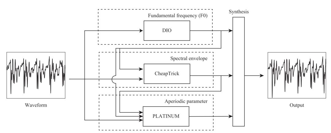 WORLD语音合成系统可以根据F0、spectral envelope、aperiodic三个参数来合成一段语音,因此,在前沿的语音合成研究中,会通过深度学习技术学习到一段文本所对应的这三个特征,然后借助WORLD合成为语音。