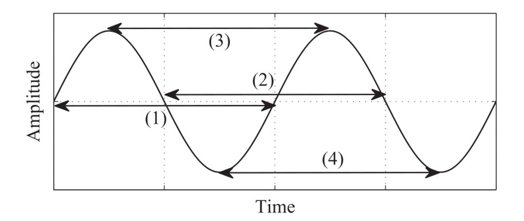 第二步:计算每一个滤波后的信号中的候选基频以及可信度,由于只包含基频的信号应该是一个正弦波,因此如下图所示,四个区间的跨度应该基本相等,我们可以计算四个跨度的平均值,用这个值的倒数来表示候选基频。同时,计算这四个跨度的标准差来作为衡量基频可信度的指标,标准差越大,说明跨度长短差异较大,那么取此频率作为基频的可信度就较低。