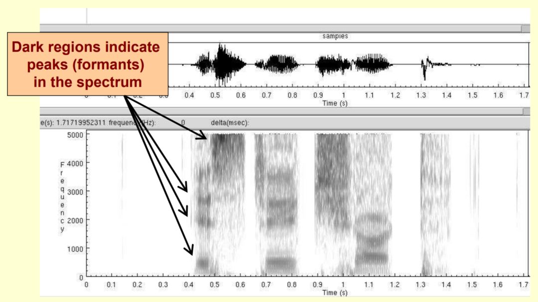 频谱包络实际上是在一个频率-振幅图中,将每个频率共振峰用平滑的曲线连接起来,而这个平滑的曲线就是语音的频谱包络,下图展示了频谱包络在频谱图中的位置。