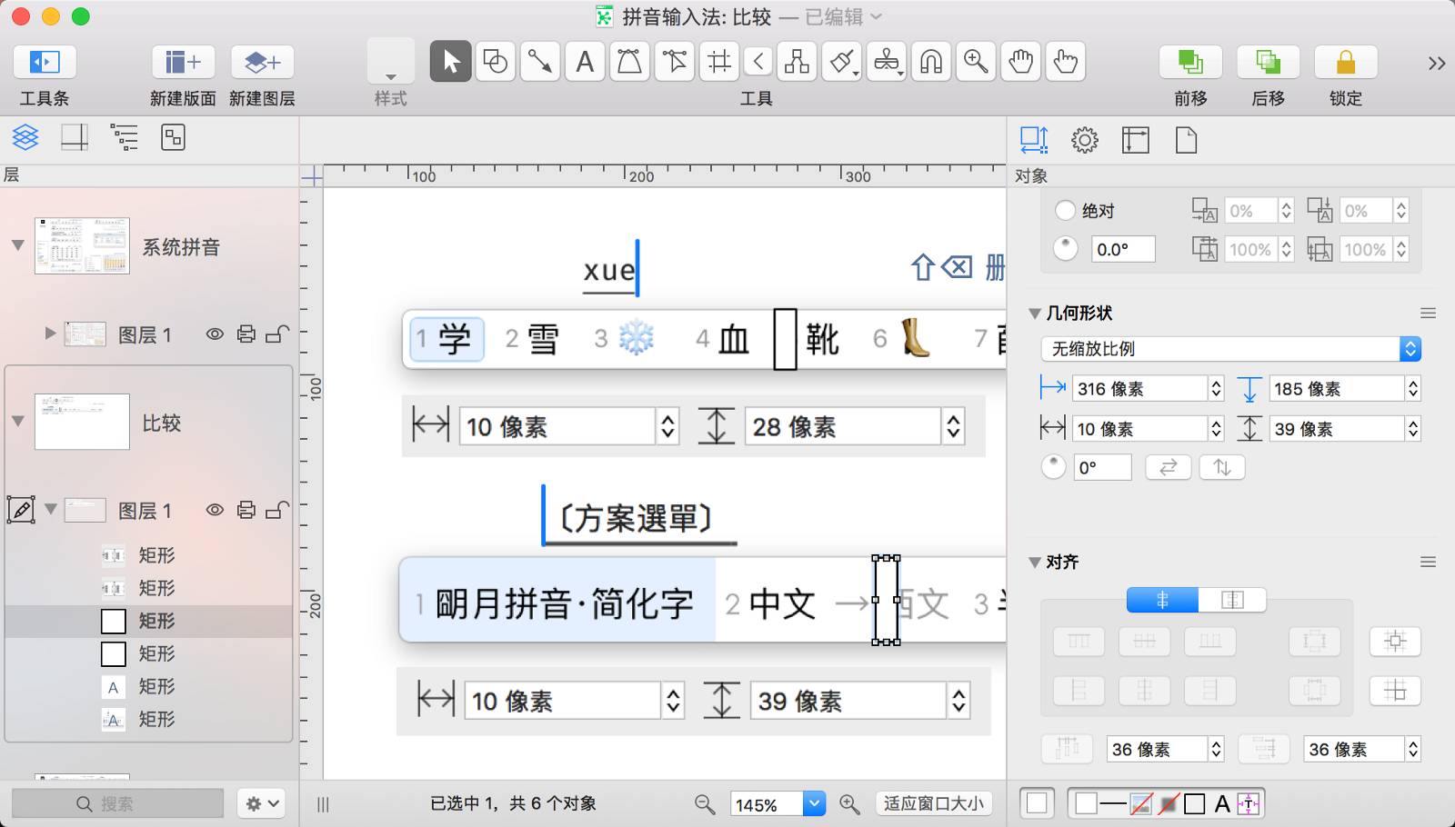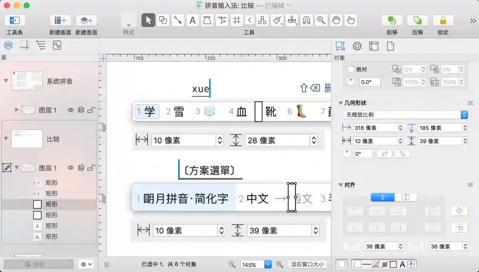 为了和前一个拼音输入法的图示保持视觉上的一致,鼠须管的截图需要缩小一些。首先通过测量判断一下需要缩放的数值,随便绘制两个矩形测量了一下拼音输入法和鼠须管候选条的高度,拼音输入法高 28px,鼠须管输入法高 39px, 28/39 ≈ 0.72,鼠须管的截图需要缩小到 72% 才能令两者的候选条高度一致。
