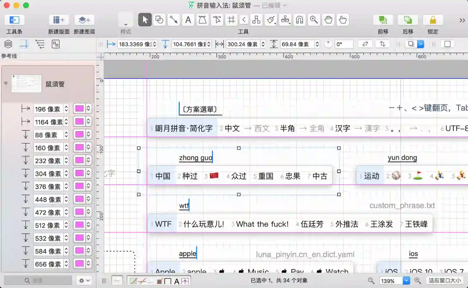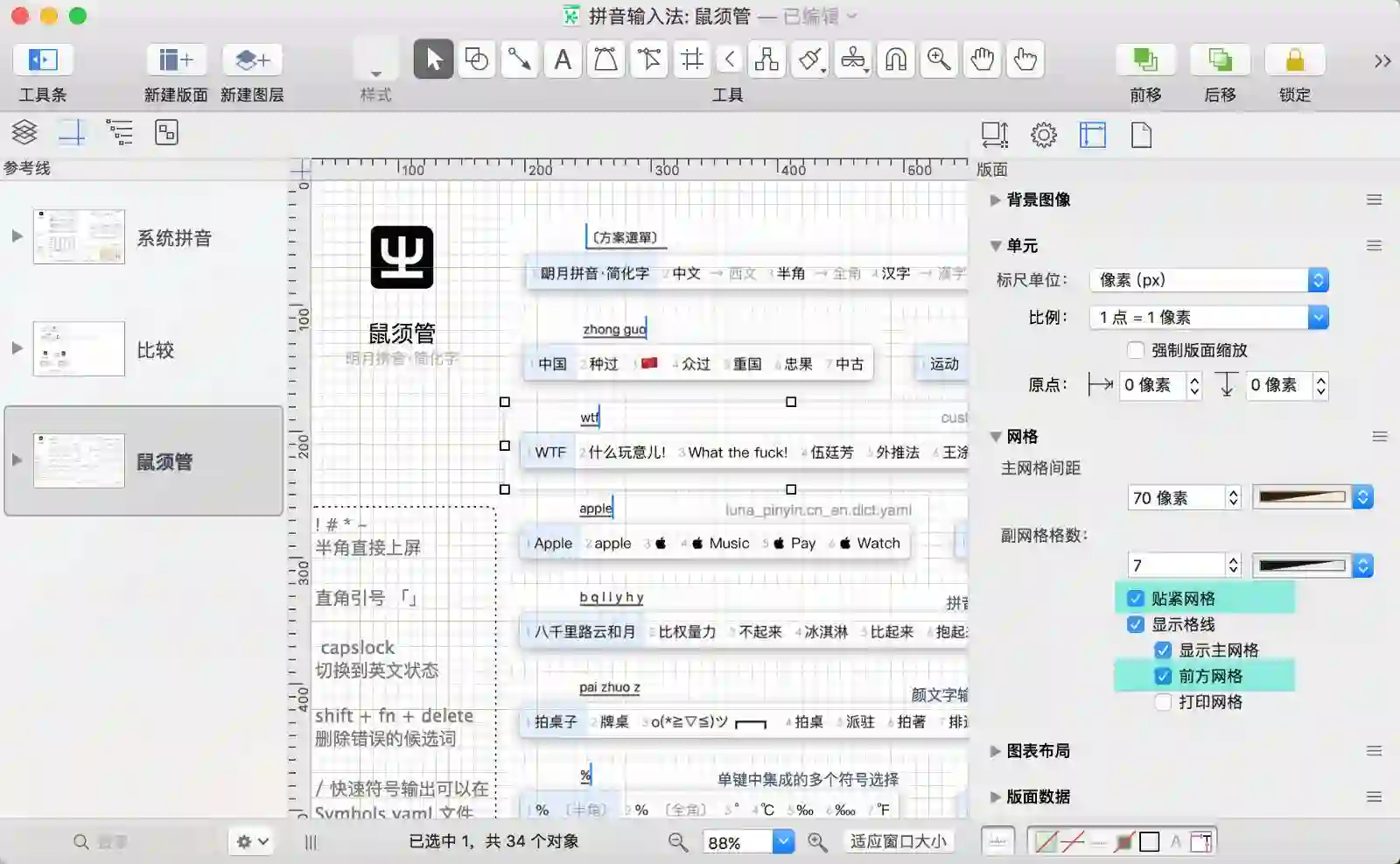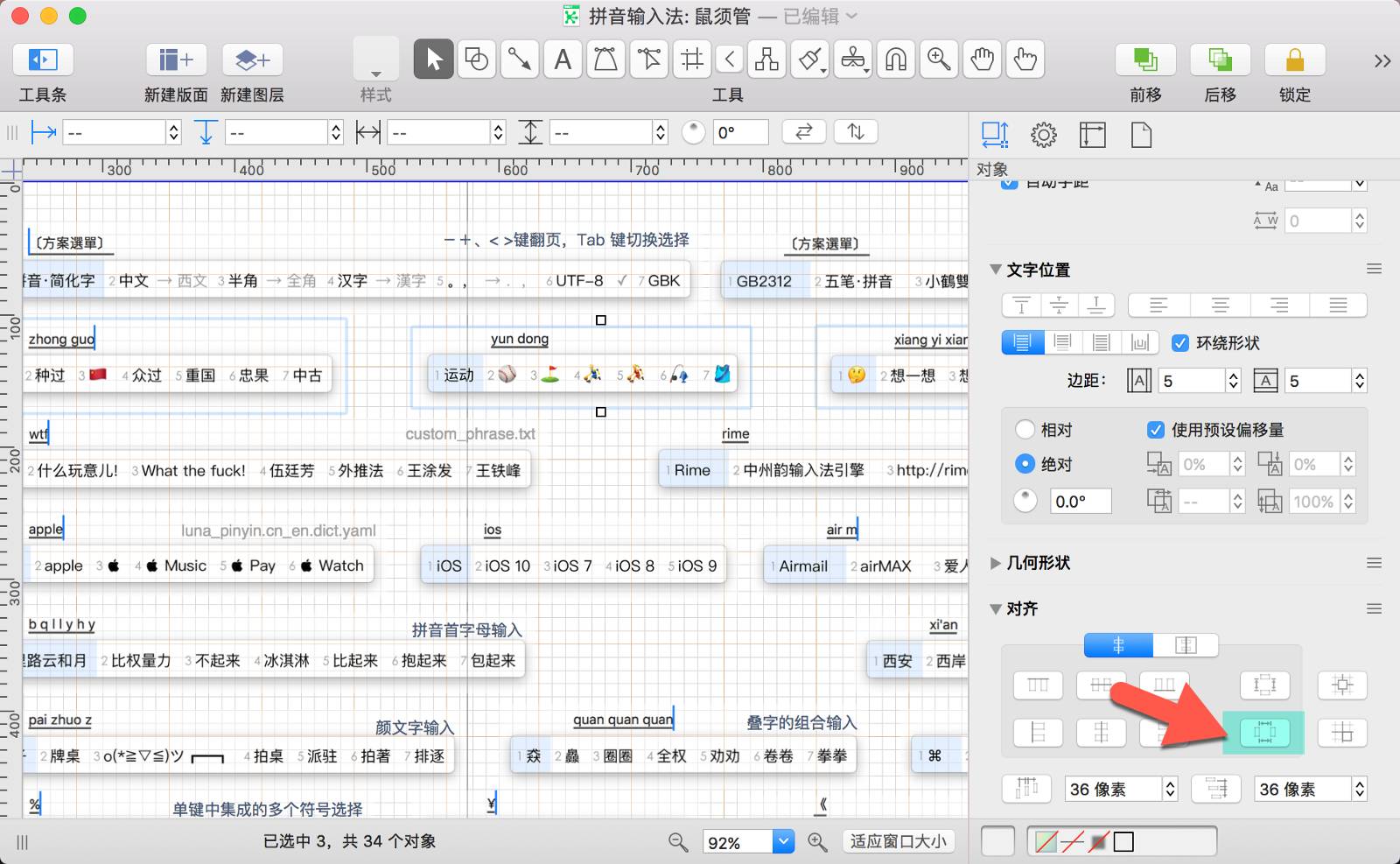 OmniGraffle 中的很多功能需要动手实践才有体会,试试把自己的输入法方案截图制作出来。如果你的笔记本是支持 Force Touch 的 MacBook,移动对象贴近参考线或时还会有触觉反馈。