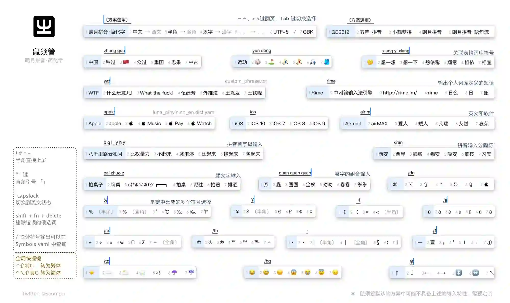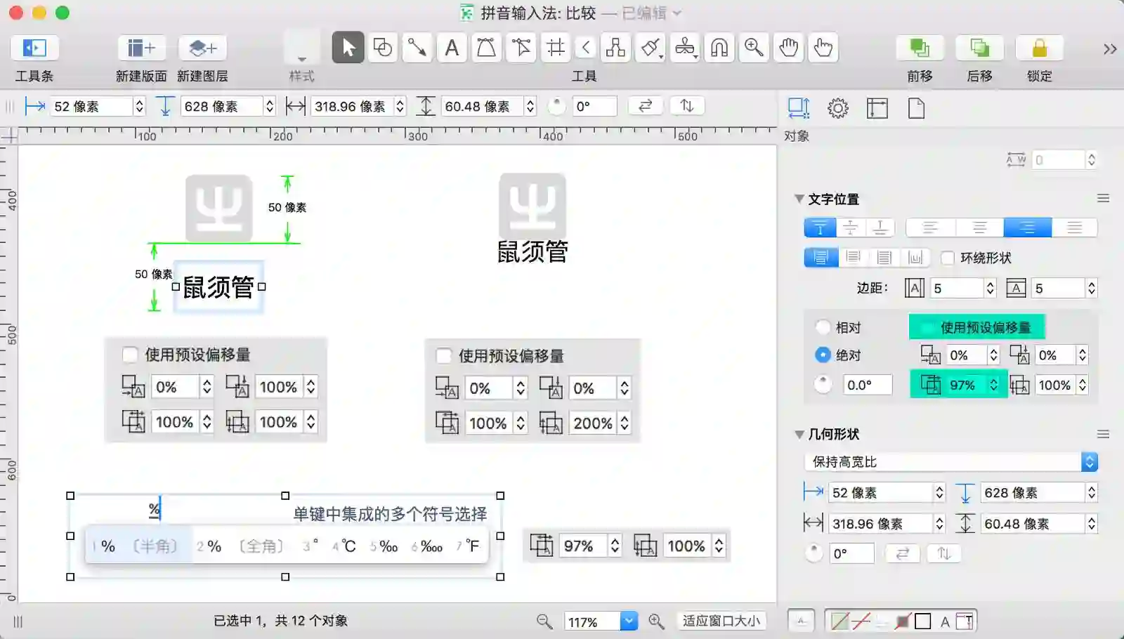 前一个鼠须管图标的文字是以形状顶部为基准增加 100%,最后文本的底部基线距离图标顶部是 100 个像素,增加了 50 个像素。 后一个鼠须管图标的偏移量虽然最大能设置成 200%,但是文字也只能贴边显示。下方的输入法候选条截图采用的是文本框内偏移设置。