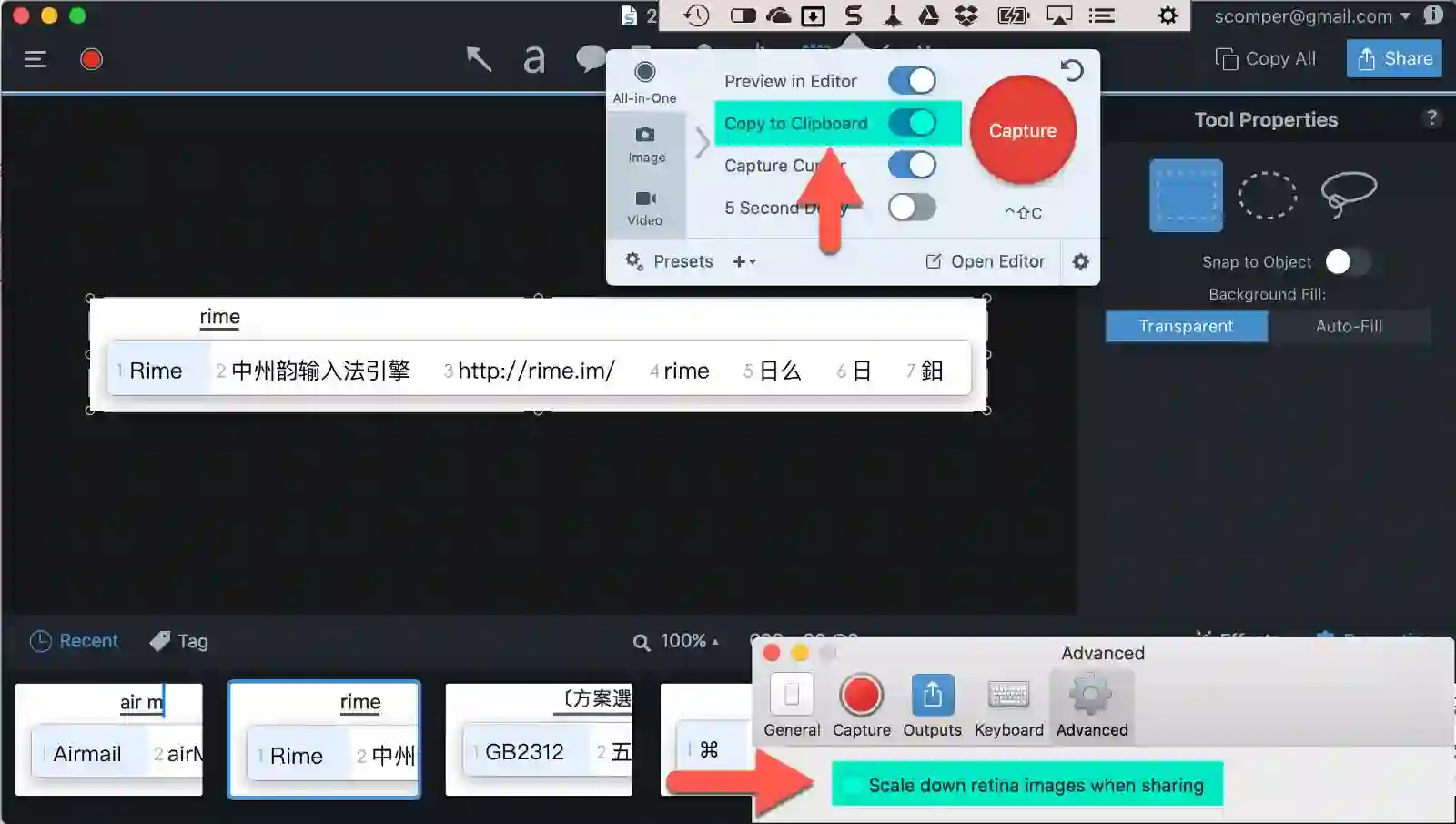 通过 Snagit 菜单栏图标,设定截图相关的设置,打开「Copy to Clipboard」和关闭「Preview in editor」,这样截图后桌面焦点不会自动切换到 Snagit。另外需要留意 Snagit 偏好设置中的「Scale down retina image …」,勾选此项 retina 屏幕上的截图会在复制分享时被压缩导致分辨率下降。