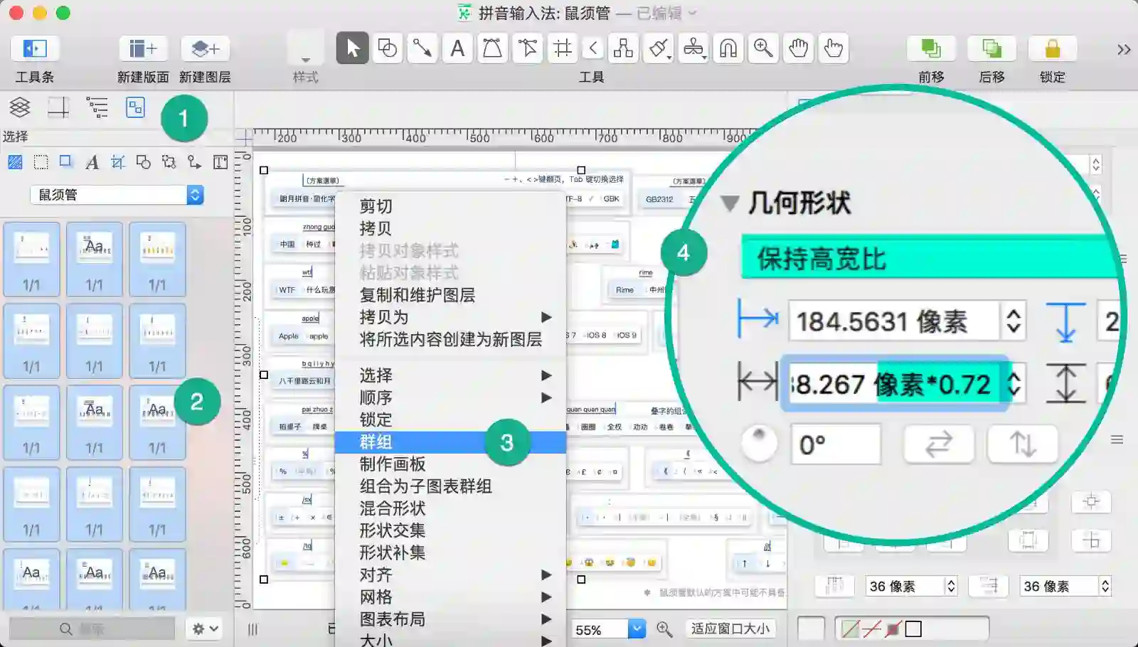 因为画布中有一堆图片需要调整大小,比较有效率的方式是选中它们后进行群组,然后统一缩放,缩放完成再解散群组。