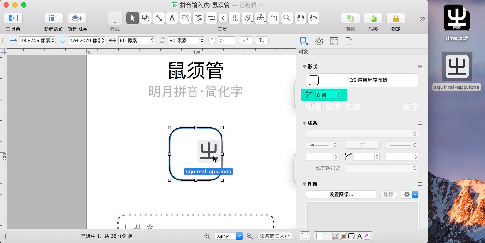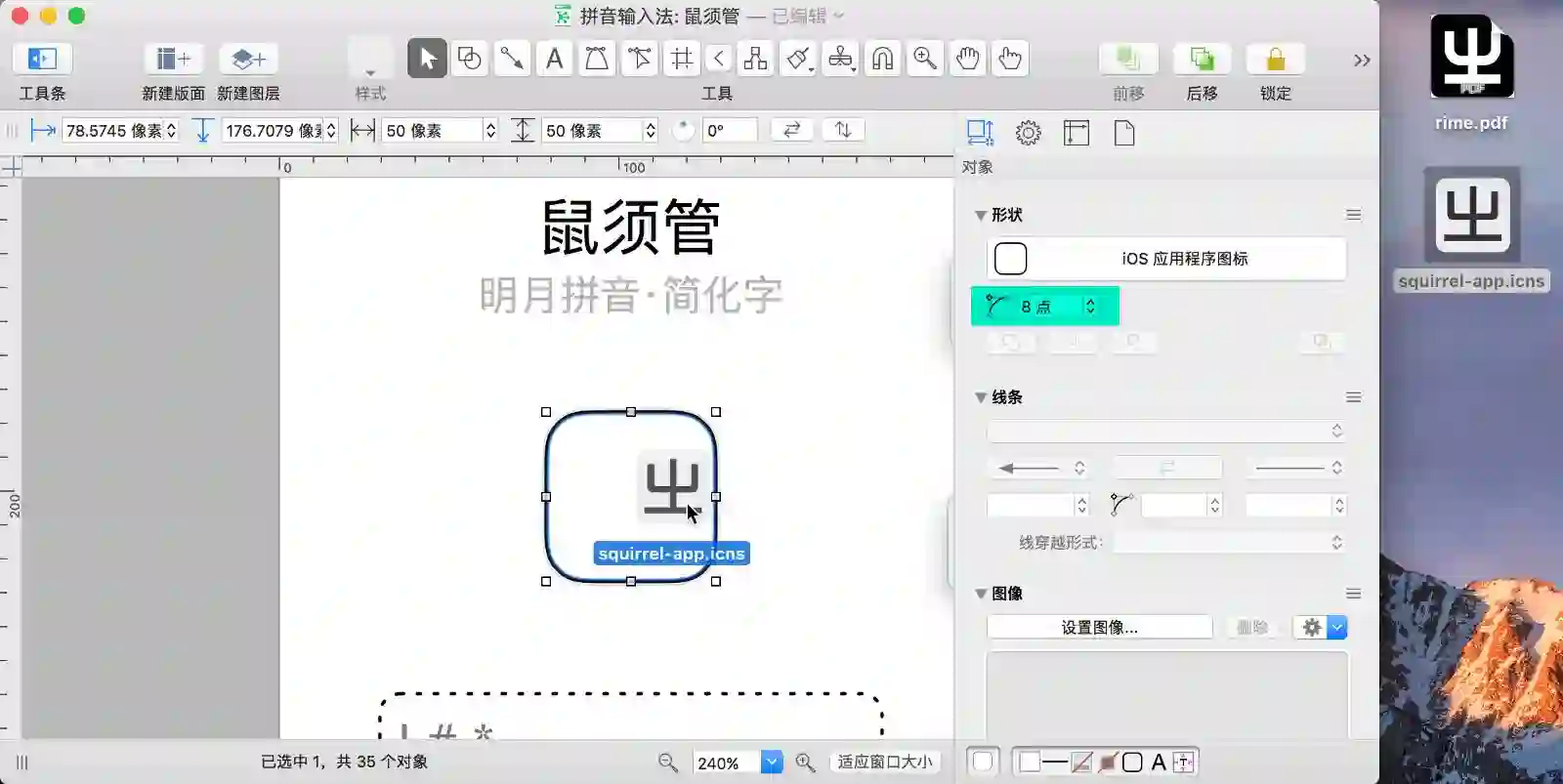 鼠须管的 Logo 是从程序包(/Library/Input Methods/Squirrel.app)中提取出来的。Finder 定位到程序包右键「显示包内容」在资源文件夹里就能找到,资源文件夹中包含两个图标文件,.icns .pdf 各有一个。复制拖拽到桌面再拖拽到 OmniGraffle 中就能直接使用。前者是位图图片,后者是矢量图片,矢量图片支持无级缩放(放大后边缘依旧锐利),所以这里优先选择 .pdf 的图标素材。