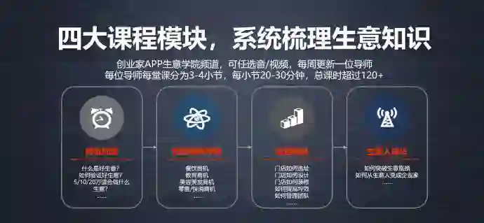 “生意学院”的课程分为30堂共120节课程,每周日更新。课程分为线下大课和线上录播两种形式,整个课程分为四大模块——商机判断、优质商机对接、运营商机、生意人成长。