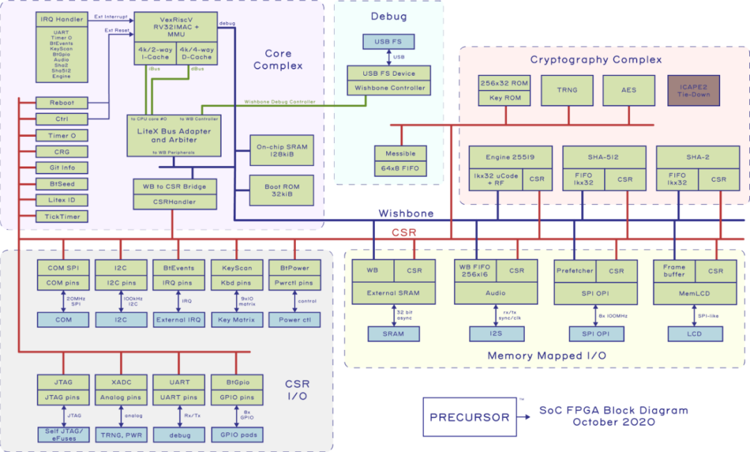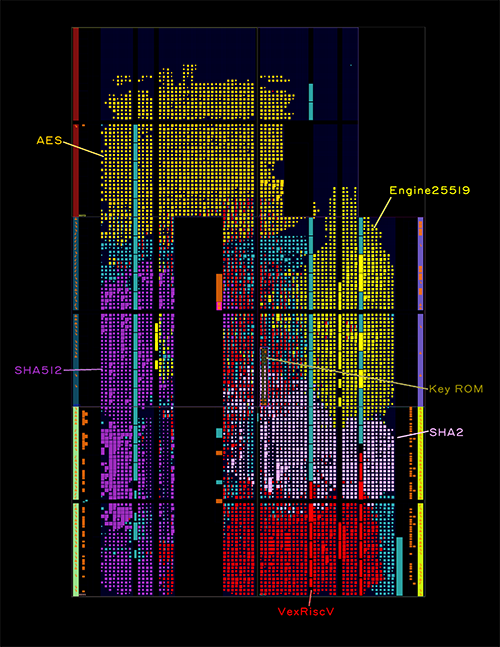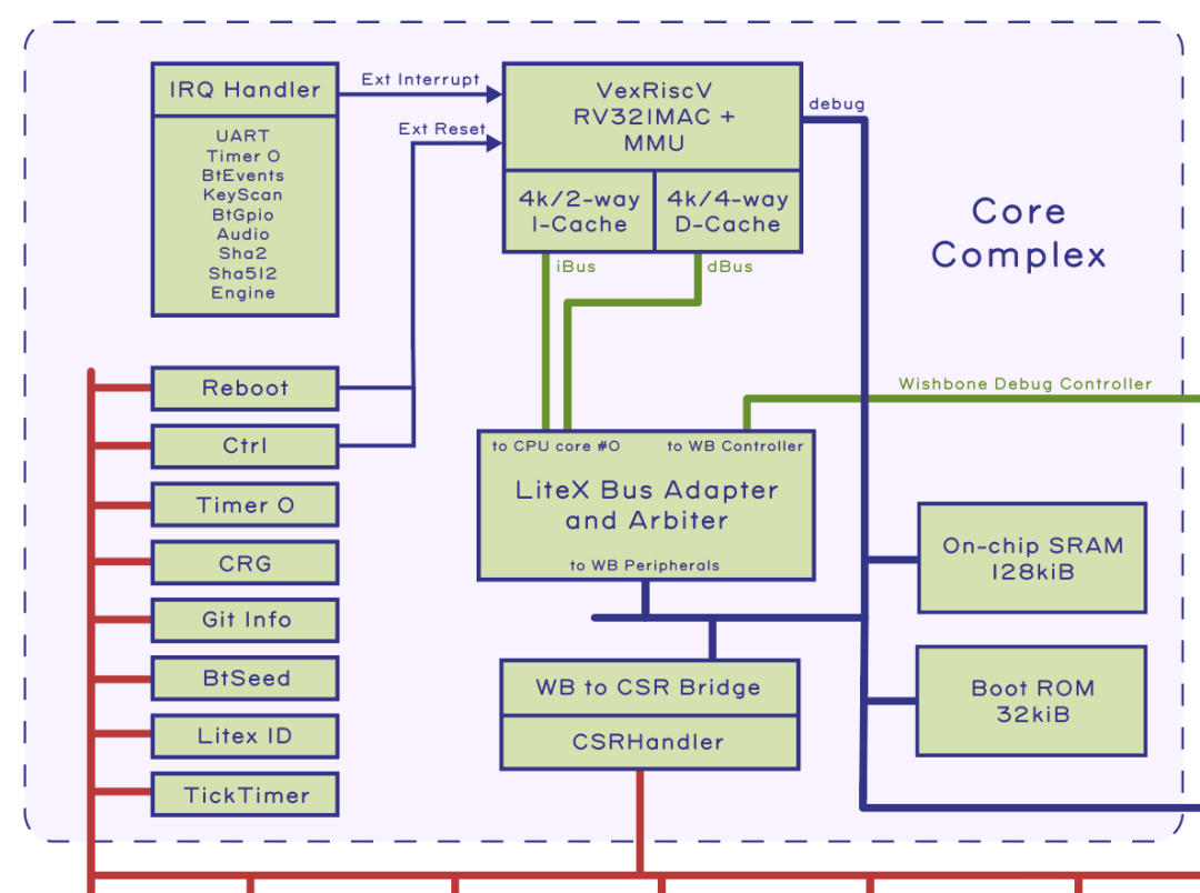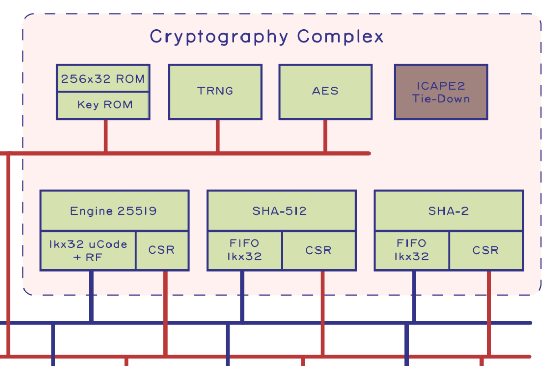“Engine25519”是算术加速器,用于加速2^255-19质数域中的操作。它是一个微指令的256位算术引擎,计算带有正规化的256位乘法仅需要大约1微秒,比在RISC-V CPU上运行同等操作大约快30倍。它需要消耗大量的资源,但依然非常重要,因为Betrusted安全通信应用程序建立在Double-Ratchet算法上,该算法非常依赖这种运算。要理解Engine25519,最好从CI文档开始阅读。该块非常大,稍后我们会单独写一篇文章来解释它的功能。
