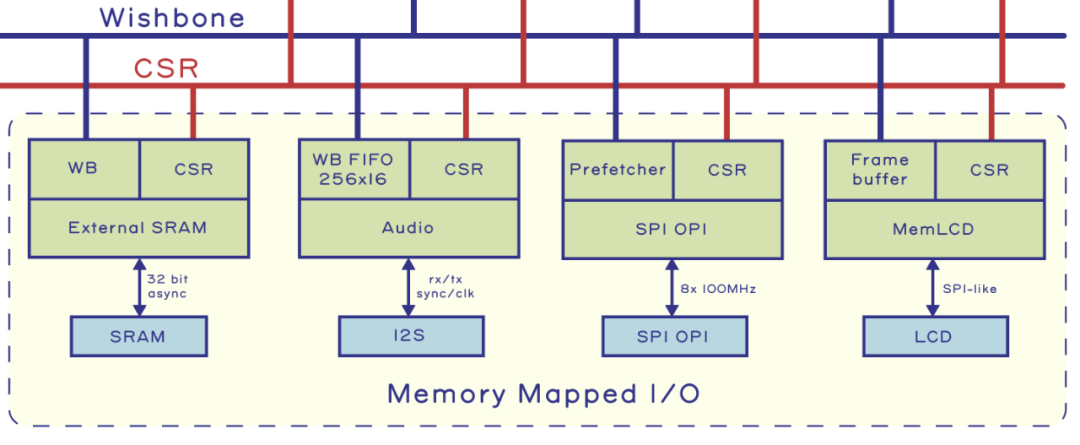 “MemLCD”是LCD的帧缓冲。Sharp Memory LCD包含自己的内部内存,因此即使宿主断电,也能够维持图像。因此,MemLCD帧缓冲就是LCD自身的缓冲。它负责管理LCD中的哪些线需要重画,在CSR上有请求发生时,它只会刷新那些需要重画的线。这样可以提高LCD的感知刷新率。如果重画整个屏幕,那么刷新率只有10Hz;但屏幕上的静态内容越多,刷新率也就越高。