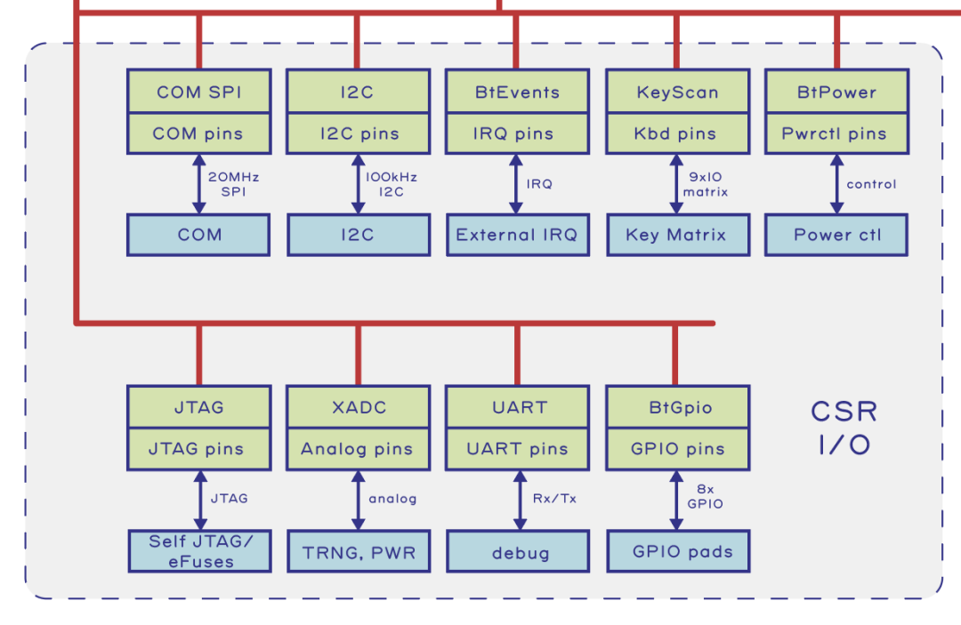 “KeyScan”是键盘控制器。它负责扫描9x10的键盘矩阵来发现击键,使用一个慢速的32kHz外部时钟源。将键盘扫描器与系统核心时钟解耦合,系统就可以在等待键盘输入时进入更低功耗状态,从而将Precursor在两次充电之间的使用时间延长数天。