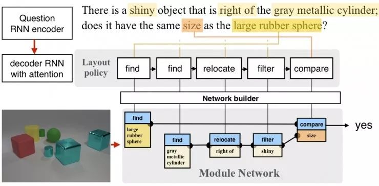 最初的这项工作基于的是一个不可微的自然语言分析器,后来2篇ICCV2017的论文就展现出了如何端到端地训练一个类似这样的系统。如果想要解答CVPR2017上Facebook AI研究院和斯坦福大学共同发布的CLEVR数据集中困难得多的组合问题,作者们认为这样的系统应当至关重要。