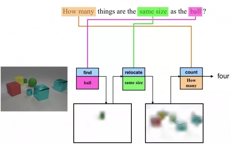 连接到视觉数据的一个核心语言界面就是问一个自然语言的问题,比如:“图中有什么动物?”或者“有多少人坐在长椅上?”每个问题中需要解决的都是不同的任务,然而目前具有顶尖表现的系统里多数都还运用的是整体性的方法,用同一个计算图或者计算网络给出所有问题的答案。然而,这些模型只有有限的解释能力,而且对于更复杂一些的推理任务就很容变得无能为力,比如:“有多少东西和球的大小一样?”如下图