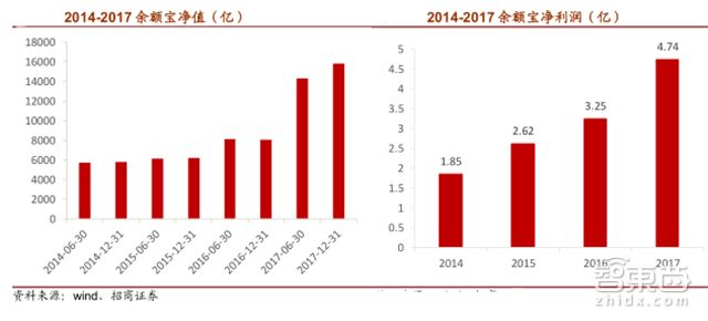 用户规模的快速增长使得余额宝的规模高速增长,从2014年底的5789亿增长到2017年底的 1.58万亿,年复合增长率达到39.72%(同期国内排名第二的货币基金融通汇财宝规模仅为 282.8 亿元,余额宝是其 55.83 倍)。余额宝的净利润总额也从 2014 年底的 1.85 亿元上升到 2017 年底的 4.74 亿元,年复合增长率 36.84%。