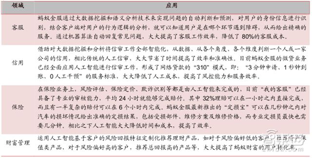 借助大数据,蚂蚁金服的人工智能已经实现了在客服、信用、保险,理财等多领域的运用,大大提高了效率,降低了成本。