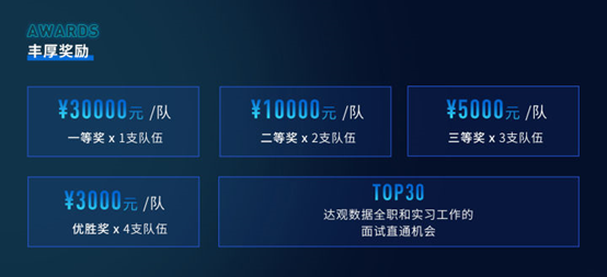 最后,看完了这篇文章能做什么呢?可以参加我们的“达观杯”文本智能信息抽取挑战赛。这是我们第三次组织“达观杯”比赛。比赛的一等奖有30000元奖金,二等奖2支队伍有10000元的奖金,三等奖有5000元的奖金,优胜奖还有3000元。除此之外,TOP30同学直接直通面试。