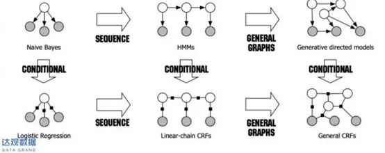在实际应用中我们用的最多还是条件随机场(CRF)。因为CRF往往效果更好。下图说明了HMM和CRF的关系是什么,我们可以看到一个HMM是链式传递,但加上一个条件就是我们最常见的链式条件随机场。通用CRF就是下图中右下角的图,但是我们做序列标注的话可能是最下面一行中间的这个图,也就是链式的CRF。它跟上面一行的图的区别是什么?大家可以看到下面一行图中有好多小的黑色正方形,这就是我们说的条件。我们是如何得出条件的?下面我们就来介绍一下如何通过真实训练得到条件。
