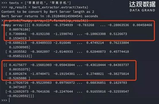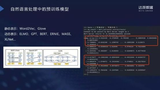 这些模型和Word2Vec/Glove最大的区别在于它们是动态模型。下图是一个真实的例子。输入“苹果好吃”和“苹果手机”后,用BERT对每个字建模,发现前两个字的向量很不一样。这说明BERT可以根据不同的上下文语境编码每个字,或者说可以根据上下文语境对同一个字做出不同的表示。