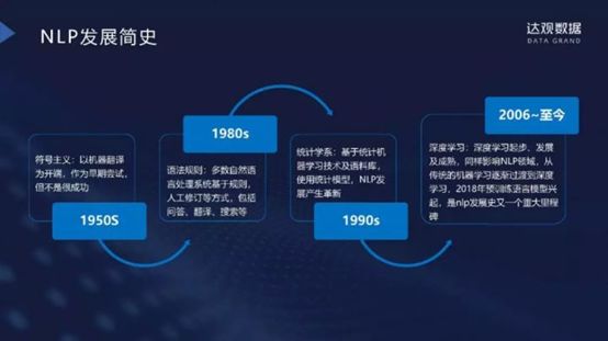 其实自然语言处理的历史非常悠久,甚至出现在“AI”这个概念之前,最早叫“符号主义”。刚开始的时候人们选择了一个很不好的场景:机器翻译。机器翻译是一个难度很大的任务,因为涉及了语义的理解和不同语种语法的规则。所以早期自然语言处理不是很成功。过了20-30年,到上世纪80年代开始,我们使用了语法规则,基于自然语言处理的一些基本原理,再通过人工在这些语法的规则上进行修订,做了一些问答、翻译和搜索方面的尝试。