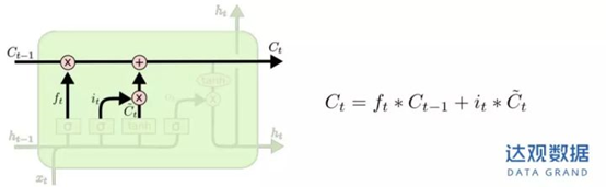 上面一步已经决定可以留下的新内容和老内容。这一步要决定如何组合新老内容。老内容可以乘以第一步计算出的f_t,新内容可以乘以第二步算出来的i_t,然后把新老内容相加,就是最新的状态了。