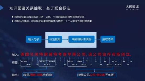 除了NER,还可以抽取别的内容。例如知识图谱就要做关系抽取。输入一句话,“美国总统特朗普将考察苹果公司,该公司由乔布斯创立”,怎么抽取关系?有两种方法。一种方式是把实体抽出来,然后两两实体做一些分类,分到一些关系里面。另一种依靠序列标注,也就是基于联合标注的方法。这么做的好处是不用修改标注框架。
