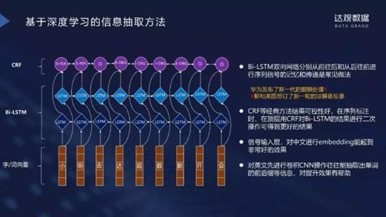 总得来说,上图介绍的Bi-LSTM+CRF方法,结合了CRF和Bi-LSTM,把“小明去达观数据开会”这几个字变成向量,通过中间的Bi-LSTM隐层,提取出来高维的特征,输入CRF层,CRF最后就会给出标签和结果。