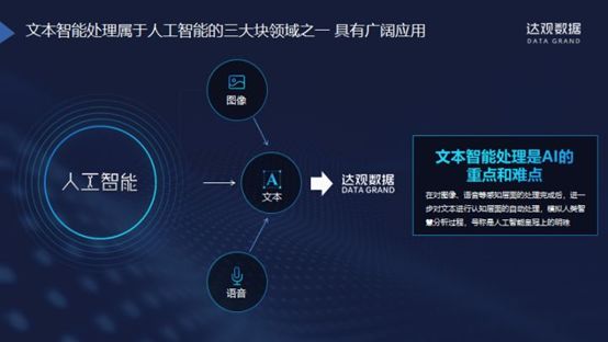下面我们开始介绍一下文本挖掘。下图中,我们可以把人工智能分为三类——图像、文本和语音,达观是一家专注于做文本智能处理的科技公司。文本相对于图像和语言来说更难处理,因为文本数据需要做一些逻辑分析。图像和语音属于感知智能,而文本属于认知智能,所以号称是“人工智能的明珠”,难度很大。