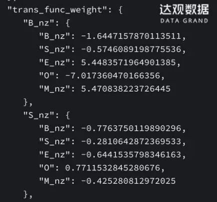什么是发射状态矩阵?简单来说就是我们在分词里每个字变成任何一个标签的概率(如下图所示)。例如“他”这个字如果来自“他来自达观数据”这句话,就是一个单字词S(ingle);但如果在“他”出现在“他们”等多字词里,标签就是B(egin);在“关心你我他”里,“他”的标签可能就是E(end)。所以你会在训练语料看到“他”有不同的标签。发射状态矩阵就是把“他”到每一个标签的概率集合起来。发射状态矩阵非常重要,它说明了每一个字到不同标签的概率。
