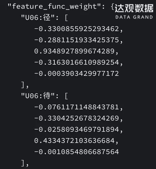 这里我们用了一个比较简单的特征模板,取了离当前字最远的前3个字和后3个字,以及它们之间的组合特征(如U07到U09这几行)。我们可以看到这个模板其实特别简单,一共只有16个特征。这种选择和我们标注好的训练集性质有关。如果研究过比赛的训练集,就会发现数据中的实体是比较简单的,不会涉及特别长的文本抽取,所以这里正负3已经可以取到一个比较好的特征了。我也试过用再复杂一点的模板去做,但是效果不如这个简单的模板好。