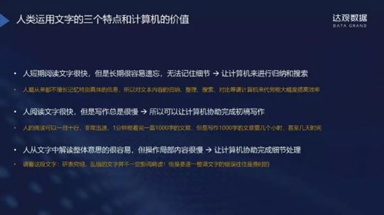 我们对比一下人类和计算机之间的差异。其实我们人类短时间内阅读理解文字的能力还不错,但是时间久了很容易遗忘。但计算机基本不会忘,只要硬盘不坏。人脑难以长期记忆,但我们对内容的推理能力比计算机强。因此,我们可以请计算机来做一些比较细节的工作。例如文字比对,我们检查错误要逐字逐句地看,非常累。计算机能做到秒看,却很难做复杂的逻辑和推理。