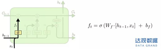 图中有两个量x_t和h_t-1。x_t就是当前的输入,h_t-1是上一时刻的隐层的输出。这个公式求出来一个0-1之间的值,决定要留下多少东西。(任何东西乘以0-1其实就是计算要留多少东西,乘以0什么都留不了,乘以1就都留下,乘0.8就留80%。)