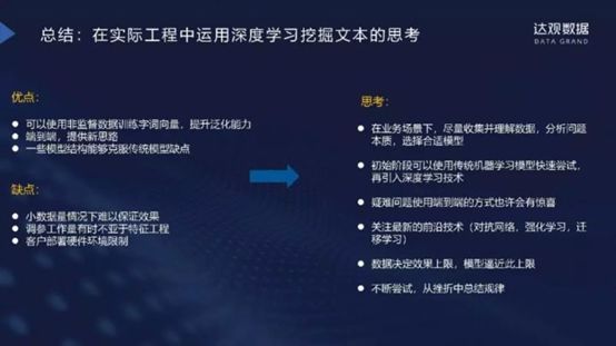 我们总结一下本文内容。在实际工作中,到底怎么来用深度学习挖掘文本?最重要的一点是要用预训练模型,通过非监督数据训练向量,提升泛化能力。虽然中间步骤难以分解,但因为深度学习有端到端的能力,所以对中间步骤要求较低。而且,深度学习能克服一些传统模型的缺点,例如LSTM的上下文依赖就比CRF强。