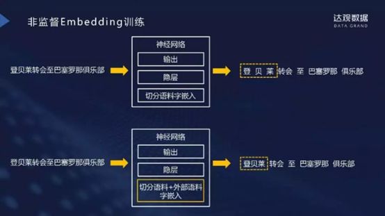 下图是我们的一个真实的例子。当时登贝莱刚转会到巴塞罗那俱乐部。我们用标准语料去训练,发现“登贝莱”这个名字一定会被切开,无论怎么训练分词都不行。潜在的解决方法之一是增加很多登贝莱相关的标注数据,但是这么做收益不足。所以我们就找了很多外部的语料做嵌入。