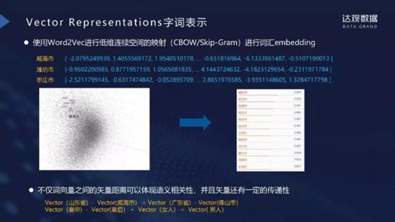 在图中“威海”、“潍坊”、“枣庄”这三个山东的城市的词汇,被转化成了三个低维向量,向量中的数都是浮点数,有正数也有负数。如果从空间的角度来看这三个向量,可以发现它们距离很近,说明从语义角度来看它们的含义很接近。而且我们还可以直接对这些词向量进行计算,例如山东-威海=广东-佛山,皇帝-皇后+女人=男人,所以词向量是很优秀的自然语言的表征方式。