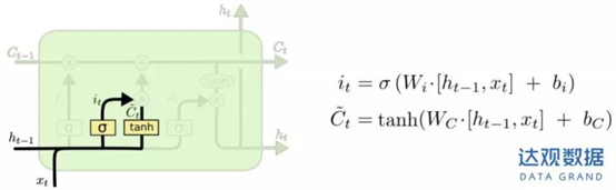 当前输入包括上一时刻隐层的输出和当前的输入。这一步骤判断应该留下来多少内容。它还是计算两个系数,一个i_t,这也是一个0-1之间的值。第二个是C_t,表示当前cell的状态。计算完毕后需要把这两个系数的值保存下来。