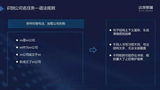 如果从历史的角度来说,识别公司的任务就是所谓的“符号主义”任务,简单来说就是穷举所有公司的名称做词典匹配。这样就是一个命名实体。但是,这么做场景其实有限。为什么?因为上市公司的集合是有限的,所以直接拿公司字典可能比训练模型更快。