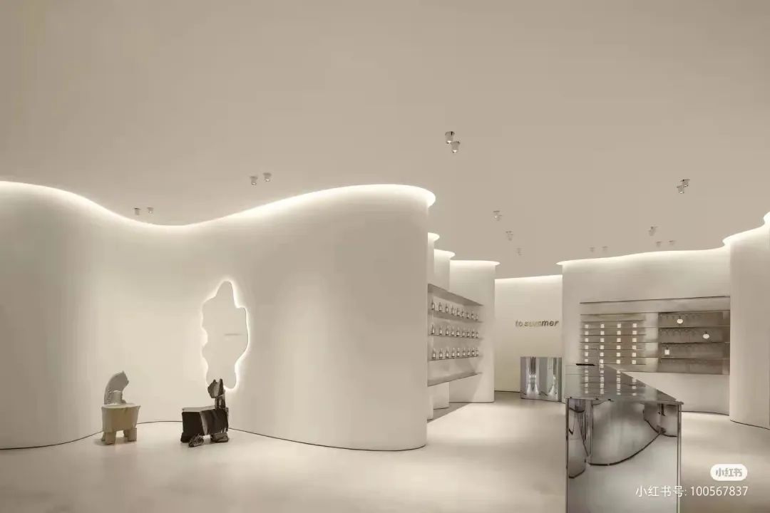 观夏将其在三里屯太古里的体验店“观夏客厅”定义为“洞穴客厅”,将水波、山石、云雾等元素融入门店装潢之中。走进门店,顾客们首先看到的不是林林总总的商品,而是粗粝岩石,幽深的造景,扑鼻而来的是「昆仑煮雪」的味道,仿佛真的置身于昆仑山间。