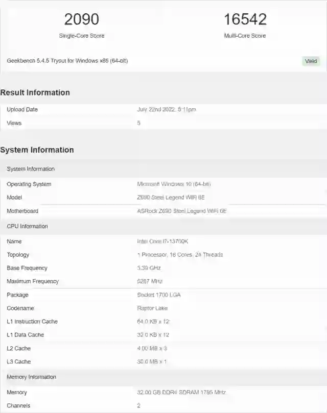 测试使用的是华擎 Z690 Steel Legend 主板,搭配的是 32GB 的 DDR4-3600 内存。结果显示酷睿 i7-13700K 的单核基准测试成绩为 2090 分,多核基准测试成绩为 16542 分。如果与此前搭配 DDR4 内存的酷睿 i5-13600K(单核 1980 分/多核 14425 分)相比较,单核基准测试成绩高出 5.5% 左右,多核基准测试成绩高出 14.7% 左右。酷睿 i7-13700K 的多核基准测试成绩也高出目前酷睿 i7-12700K 大概 17%,毫无疑问也击败了 AMD 旗舰级的 Ryzen 9 5950X。