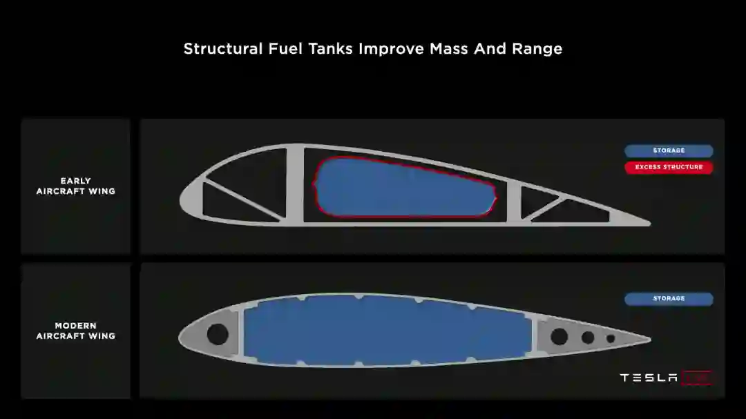 要说最贴切的形容还得是特斯拉,这张飞机机翼剖面图形象地说明了 CTC 设计的精髓。现代飞机充分利用机翼空间储存燃油,除了增大了载油量和航程之外,也利用油箱的结构参与机翼受力,从而减少了机翼所需的额外支撑结构,减轻了重量。
