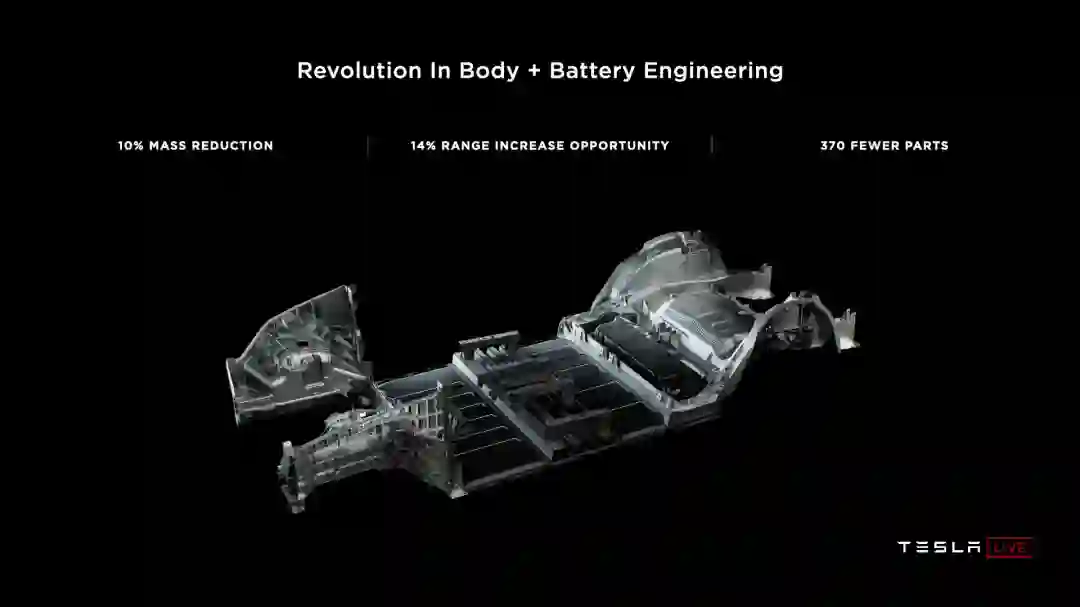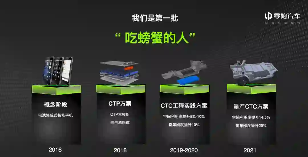 去年七月刚公布这种设计方案时,零跑称之为“CBC”;今年在 C01 上,他们换回了这种技术更广为人知的叫法——CTC,全称 Cell to Chassis。同样在 2021 年,比亚迪在发布 e 平台 3.0 时也表示,新平台将支持 CTC 车身设计。如果我们再往前看,2020 年九月“电池日”活动中,特斯拉发布了结构电池设计,第一次将 CTC 这个名词带到公众眼前。