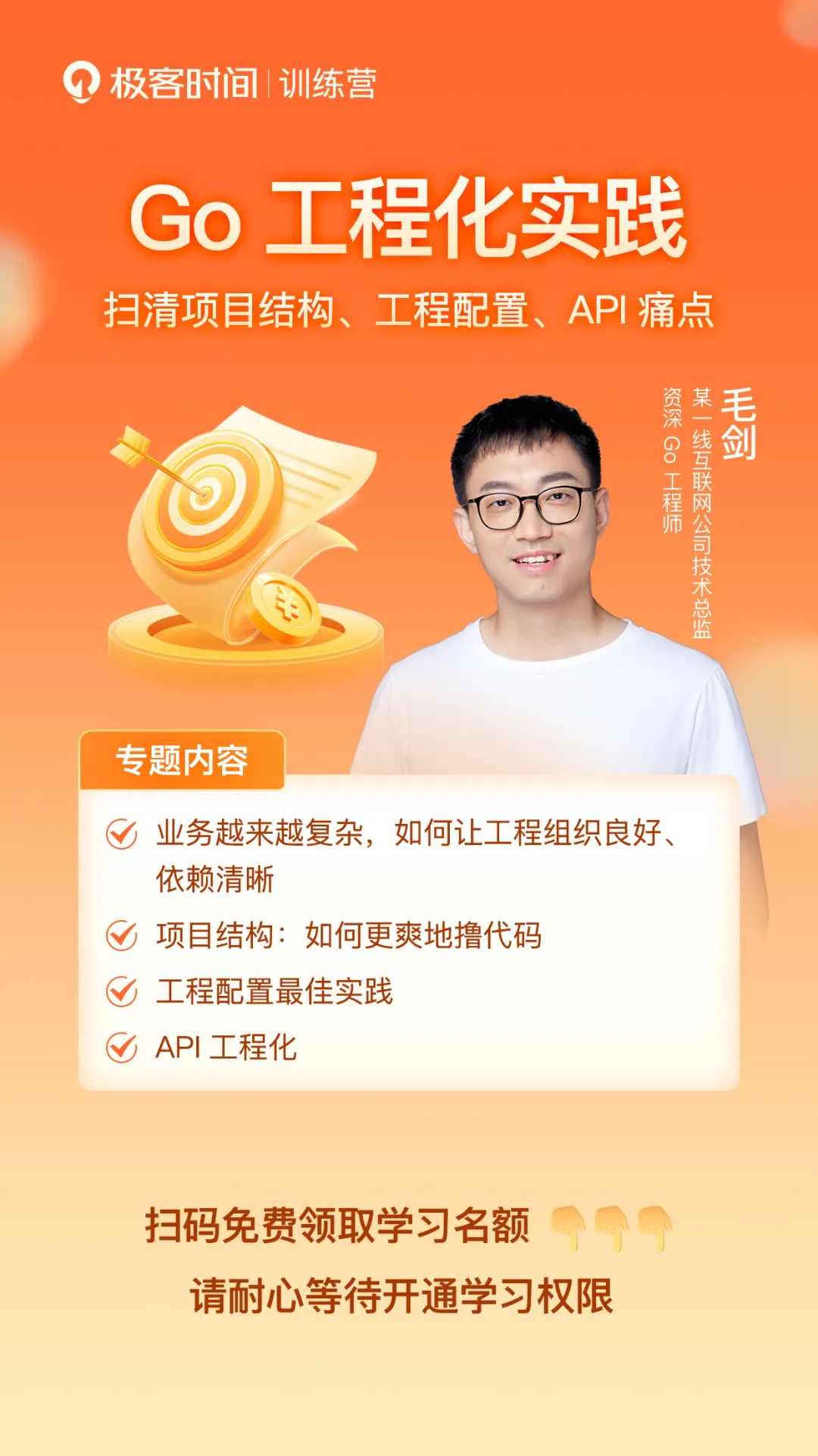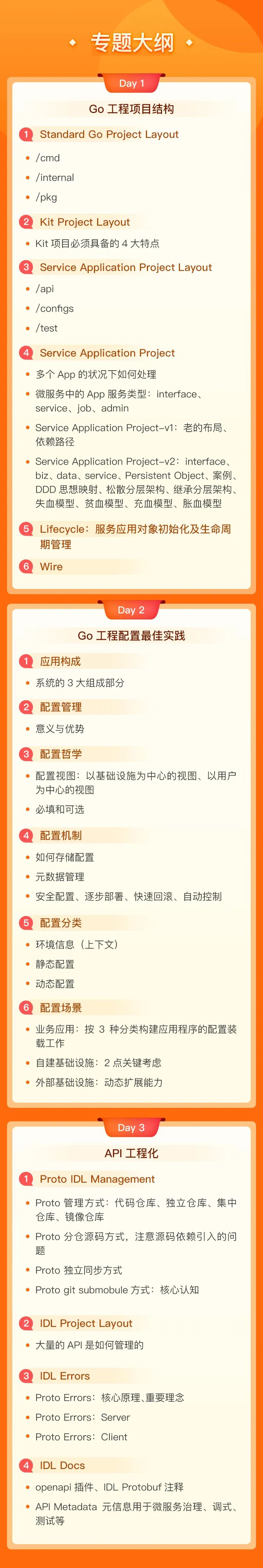 代码怎么才能整洁、健壮; 如何通过配置管理来巧妙应对故障; 在项目中API该如何组织以及API依赖该如何处理; API该如何设计,包括错误码的设计…