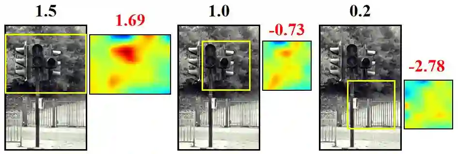 首先我们对比来自训练集中同一张图片的三个不同子图的美学评分。黑色数字表示其的标注评分,红色数字表明了其预测评分。可以看到,子图的预测评分的相对大小关系与标注评分是一致的,这表明了模型通过使用ranking loss学习到了训练数据集中的美学评分偏好。进一步,预测评分下的热力图表明了子图中每个区域的预测评分,而预测评分则是整个热力图的均值。前两个子图中有重叠的区域,然而其预测评分却不一样,这是因为重叠区域在两个子图中的构图分区不一样。第三个图的预测评分很低,这是因为它没有捕捉到整个图片中最显著的物体,信号灯。上述结果表明了我们的模型确实是同时考虑了构图分区和物体显著性的。