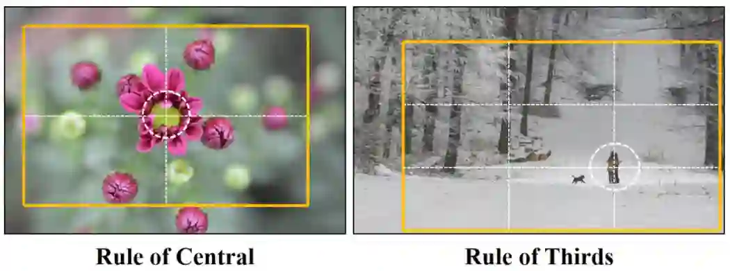 为了找到最佳子图,图像裁剪模型一般会先生成大量的候选子图,然后对每张子图逐个进行美学评分,最终确定评分最高的子图。因此,一般来说,图像裁剪模型通常由候选子图生成模型和美学评分模型两个部分组成。早期的研究通过利用一些摄影知识来实现美学评分,比如使用人类总结的构图规则,像是三分法和中心法则。它们通过定义并抽取相应的特征来衡量子图的构图优劣。