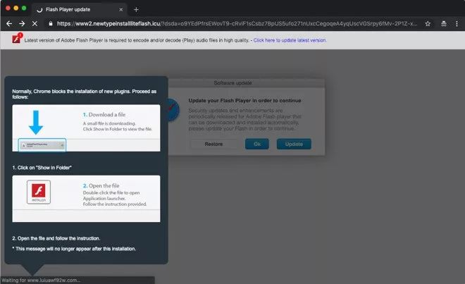 在Mac电脑屏幕上显示Adobe Flash Player需要更新的通知,并敦促用户打开一个试图在浏览器中下载的文件;一旦用户点击下载并运行恶意软件,最终将导致Shlayer木马感染所用Mac电脑。