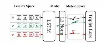 我们的目标是学习一个嵌入函数,它将符号标记序列从特征空间映射到度量空间,从而使语义相似的序列彼此映射得更近,而非相似的序列则相距更远。这背后的一般思想被称为度量学习。近年来,人们提出了基于三元体神经网络的深度学习方法来学习这种嵌入函数。三元体神经网络通过优化输入三元体网络上的排名问题来学习度量标准。三元体网络由锚点序列、正序列和负示例组成。这三个例子通过相似度关系相互关联,也就是说,正面的例子应该比反面的例子更类似于锚点的例子。三重网络训练学习一个函数,该函数将实例嵌入度量空间,其中正序列比负序列更接近锚点实例。