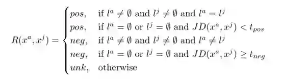 如果我们没有可用的标签信息,我们使用jaccard距离jd作为代理距离度量来确定x a和x j之间的关系。如果JACCard距离低于阈值t pos,则关系为正;如果高于另一阈值t neg,则关系为负。如果JacCard距离高于正阈值t-pos,但低于负阈值t-neg,我们将关系定义为未知。