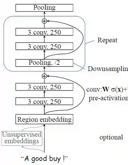 然后是卷积快的叠加(两个卷积层和一个shortcut连接,其中shortcut连接类似于残差连接),与步长为2的最大池化层进行下采样。最后使用一个最大池化层,得到每个文档的文档向量。
