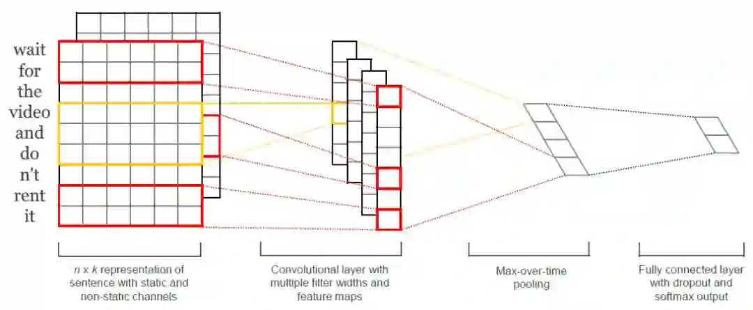 Kim在EMNLP2014提出的TextCNN方法,在多个数据集上取得了很好的效果。由于其计算速度快以及可并行性,在产业界得到了广泛使用。TextCNN的模型示意图如下图所示。